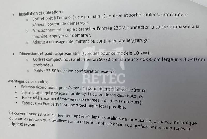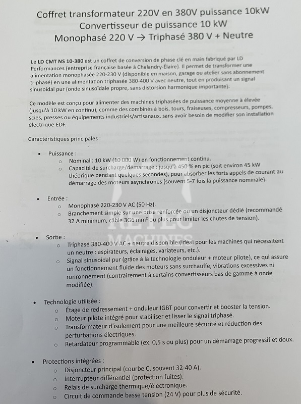 Caracteristiques - Coffret transformateur 220 V mono en 380 V tri