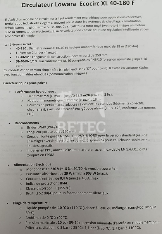 Caracteristiques - Pompe LOWARA ECOCIRC XL 40-180 F - No. 2