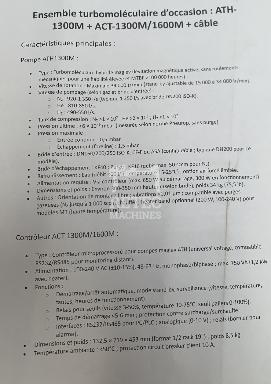 Turbomoléculaire ALCATEL/ADIXEM ATH-1300M + ACT-1300M/1600 M